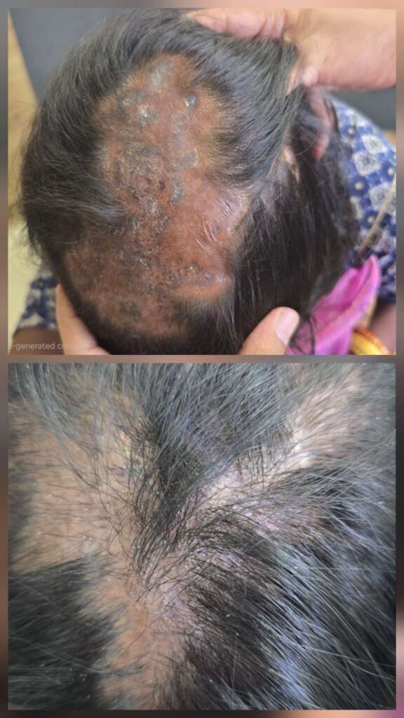 જે જગ્યાએ સકારિંગ થઈ ગયું હોય ત્યાં વાળ પાછા આવવા મુશ્કેલ.પણ ઉપચારથી રોગ રોકાઈ જાય અને બાકી વાળ સુરક્ષિત રહી શકે છે.